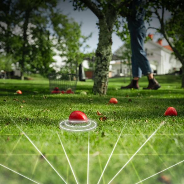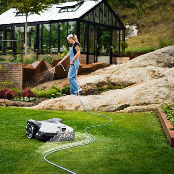 - Kameran analyserar vad den ser: till exempel leksaker som ligger kvar på gräsmattan, trädgårdsmöbler eller ett igelkott som korsar tomten. Baserat på detta ändras klipparens beteende för att undvika stopp och skydda djur eller andra objekt.