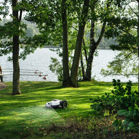 Robotgräsklipparen navigerar med centimeterprecision utan begränsningskabel och du kan enkelt skapa virtuella gränser, zoner och tillfälliga “no-go-områden” direkt i appen.